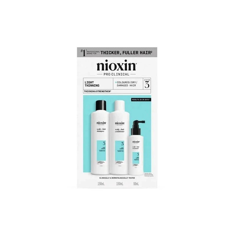 Nioxin Pro Clinical's System Kit 3 is designed for dry, damaged, colored hair with light thinning. Clinically and dermatologically tested, this complete scalp & hair thickening system thickens and strengthens your hair against breakage while providing color protection. 8 out 10 users saw thicker, fuller hair in 30 days!