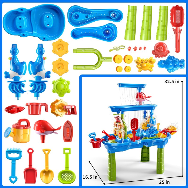 - 3-Tier Toddlers Sand Water Table Toys - Water play table (32.5"x25"x16.5") is suitable for toddlers and kids, set includes water table, dolphin funnel, teeter-totter, watering can, boat, shovel, spoon, rake, sieve, crab and crocodile sand mold,and etc; various shapes can satisfy children's curiosity. It's large enough for multiple kids to play together, work on social and sharing skills.