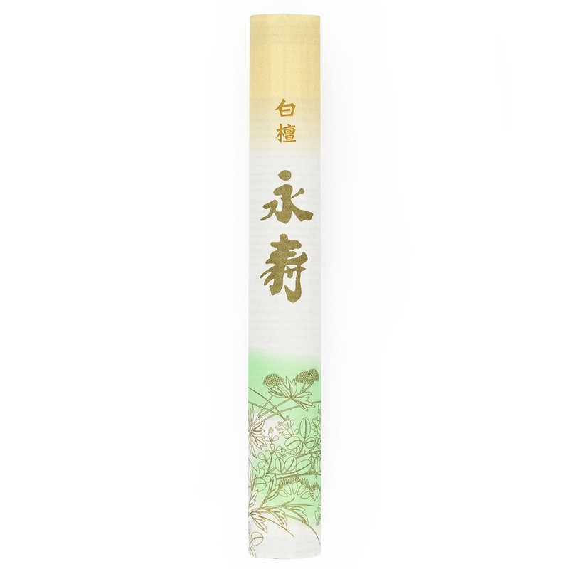 - Selector's Notes: This pack of 50 sandalwood incense sticks is part of Nippon Kodo’s Eiju (‘Long Life’) line. The bright green sticks are presented in a beautifully illustrated decorative paper roll