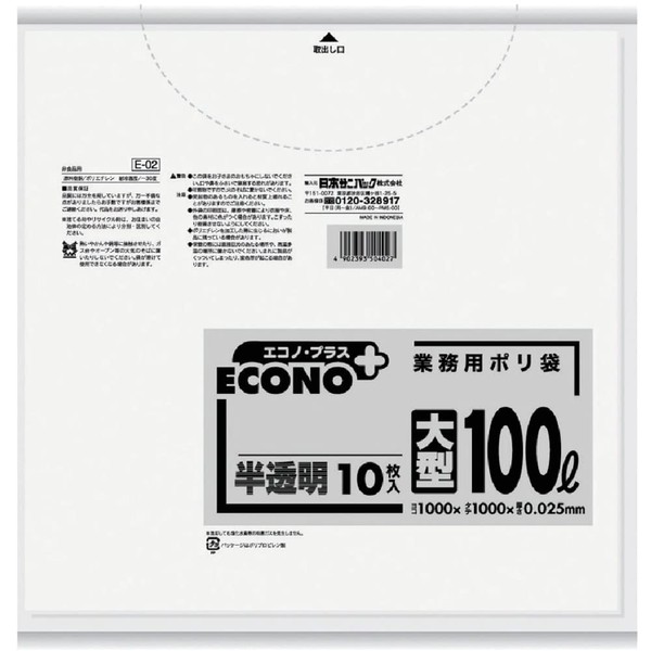 Nippon Sanipack E-02 Trash Bags, Plastic Bags, Commercial Use, Super Large, Translucent, 3.5 gal (100 L), 10 Bags