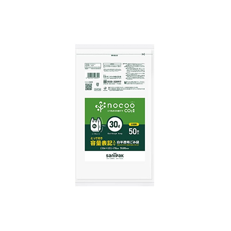 Nippon Sanipak nocoo CHT39 Trash Bags with Handle, 7.9 gal (30 L), White, Translucent, 50 Sheets, 0.015 (Capacity Notation)