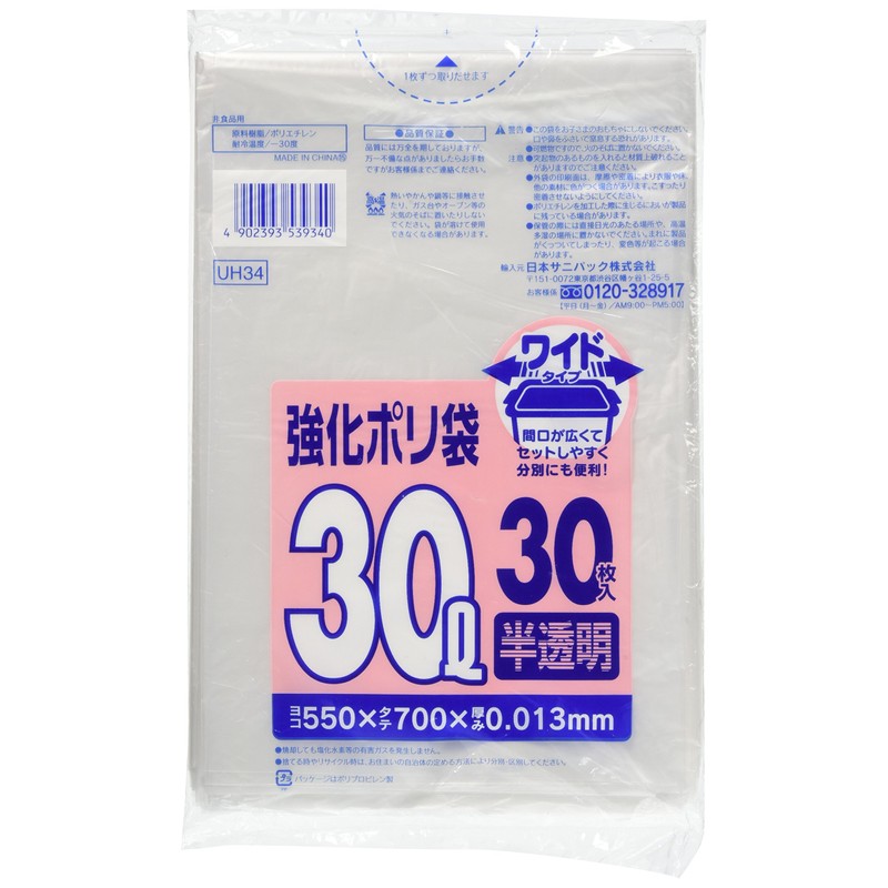 Nippon Sanipak Reinforced Plastic Bags, Translucent, 7.9 gal (30 L), Pack of 30, Thickness 0.005 inches (0.013