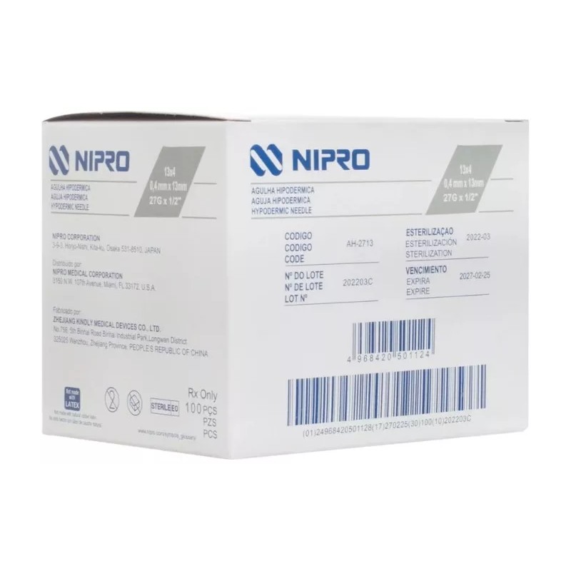 Las agujas hipodérmicas Nipro cuentan con la tecnología "Ultra Thin Wall" la cual permite un mejor flujo de la solución, fabricadas en acero inoxidable, silicononizada y punta tribiselada permite una suave punción, minimizando el trauma. Indudablemente, es producto que no debe faltar en ningún botiquín, consultorio, farmacia u hospital.