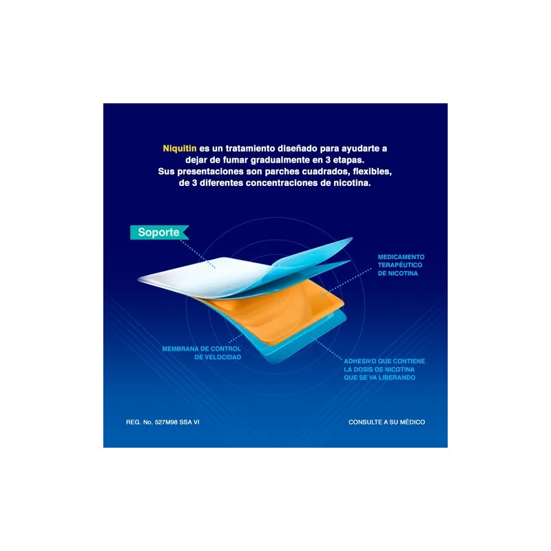 Los parches Niquitin Etapa 1 liberan nicotina de forma constante durante 24 horas, ayudando a aliviar los síntomas de abstinencia, como ansiedad, irritabilidad y fuertes antojos, que son los principales obstáculos al intentar dejar de fumar. Su sistema avanzado de liberación transdérmica asegura una absorción eficaz y uniforme, manteniendo niveles estables de nicotina en sangre para reducir el síndrome de abstinencia sin necesidad de fumar.