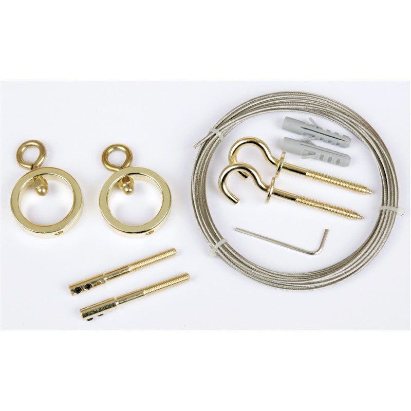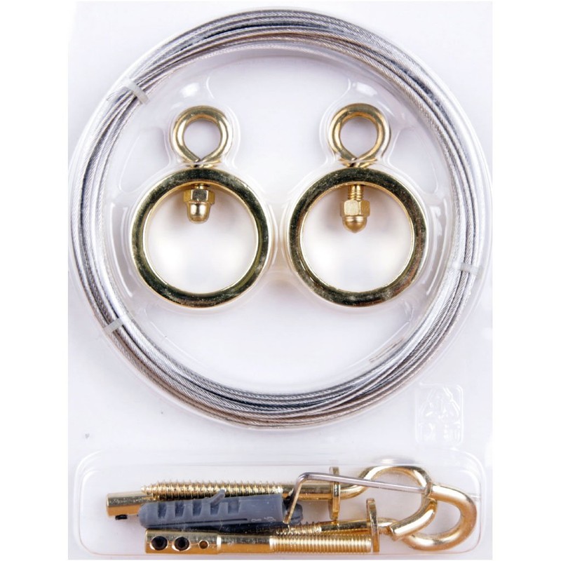 - Box contents: 1 x cable tension set with 5 m stainless steel wire rope, 2 mm diameter, including mounting material, selection: cow gold – glossy