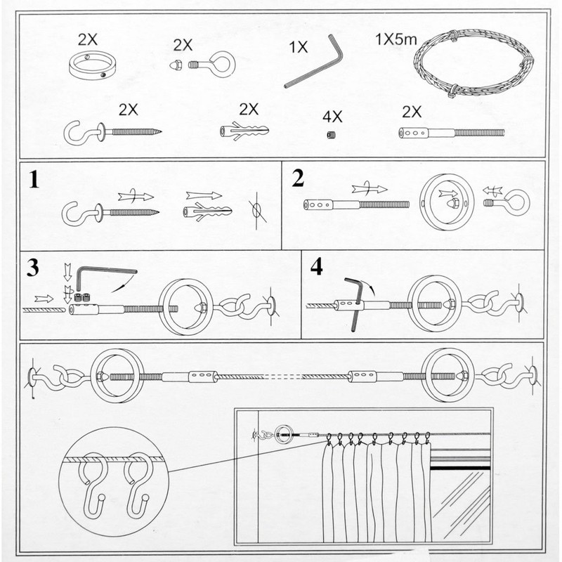 Then our rope tension set is the perfect option. It consists of an approx. 5 m long and 2 mm thick stainless steel wire rope. This stainless steel wire rope can be individually shortened and thus adapted to your home. It creates the necessary tension and provides optimal stability it needs so that your curtains do not sag.