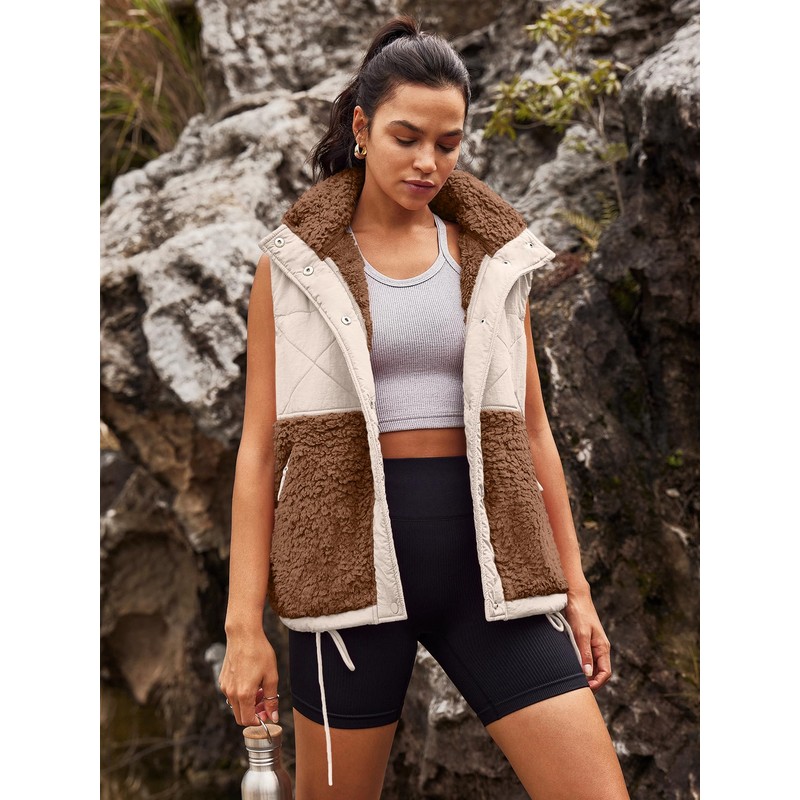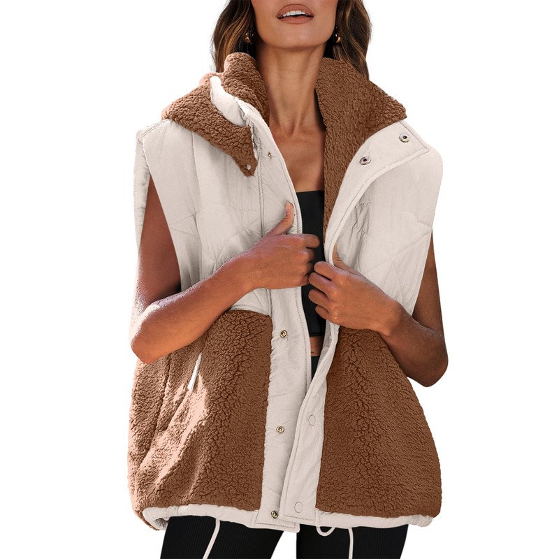 Nirovien Womens Button Down Puffer Vest Stand Collar Sleeveless Padded Jacket Coat Color Block Fleece Vest(Beige Brown,M)