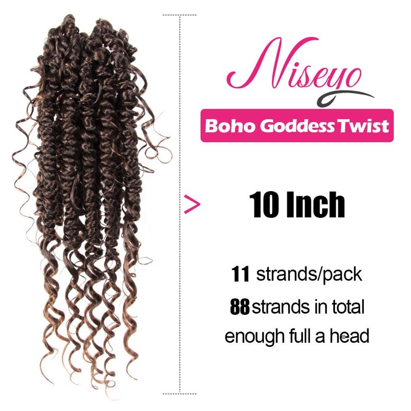 NISEYO Goddess Passion Twist Crochet Hair with Curly Ends 10 Inch, 8 Packs Boho Style Crochet Passion Twist Hair Pre looped, Short Pre-twisted Boho Braids (T30,Ombre Medium Dark Brown)
