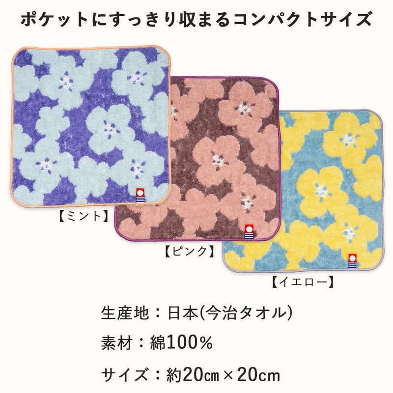 • Mini Towel Handkerchief Specifications: Country of Origin: Japan (Imabari Towel); Material: 100% cotton; Size: Approx. 7.9 x 7.9 inches (20 x 20 cm); Set Includes: Imabari Towel 3 color set (Mint, Pink, Yellow)