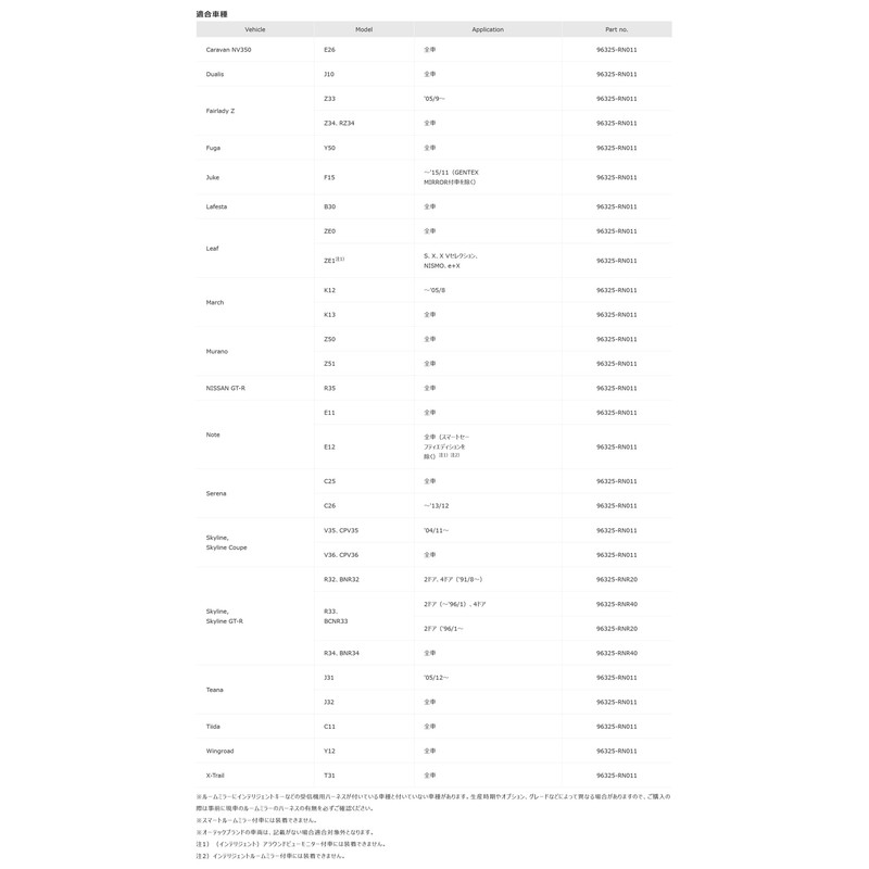 - Compatible models: Caravan NV350 E26 All Cars, Dualis J10 All Cars, Fairlady-Z Z33 2005/9, Z34 All Cars, Fuga Y50 All Cars, Juke F15 (Except Gentex Milror Vehicles) March K12 to 2005/8, K13. ■ GT-R RR All 35 vehicles: Skyline, Skyline Coupe V36, CPV36