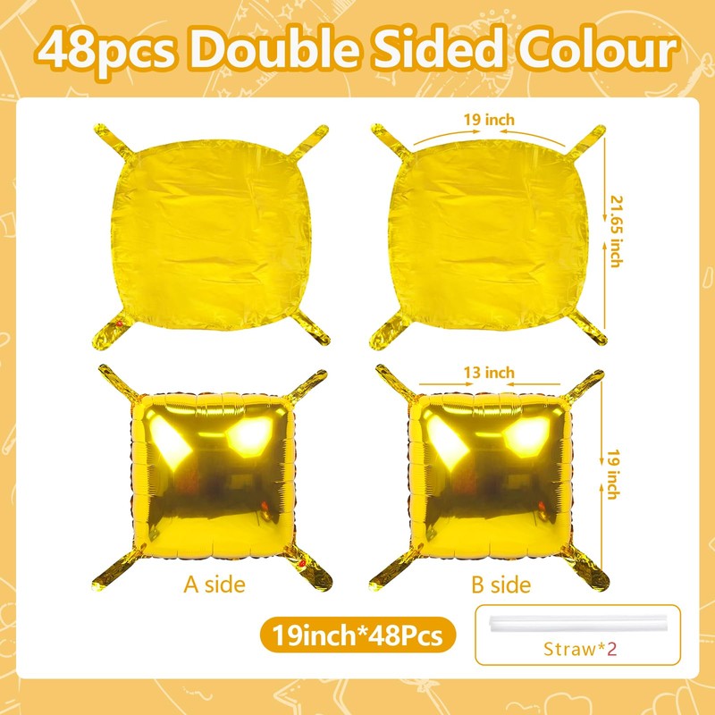 - Valuable Package: You will receive 2 straws and 48pcs two sided gold square foil balloon wall. Each square balloon measures 19*19 inches before blowing and 13*13 inches after blowing. Our foil balloon wall backdrop is crafted from high quality mylar material. Compared to latex balloons, aluminum foil balloons can maintain their shape for a longer period of time and are less likely to leak or pop