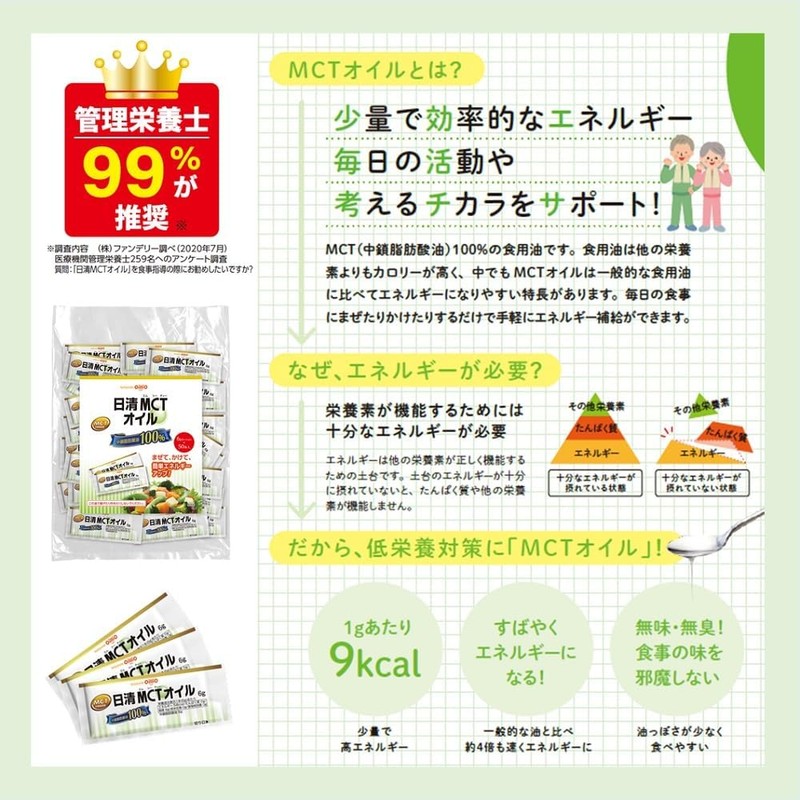 Nissin MCT Oil 6g x 50 bottles MCT 100% Easy to use as energy Recommended by 99% of registered dietitians Small portions Convenient to carry