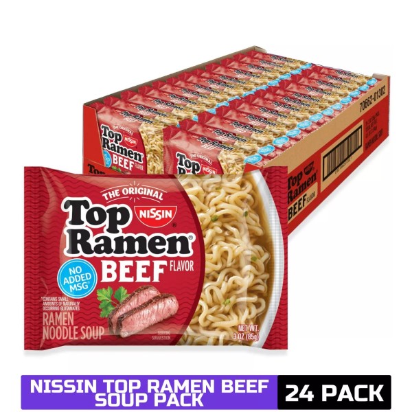 Indulge in the timeless taste of Nissin Top Ramen Noodle Soup in Beef flavor with this convenient 24-pack. Whether you seek a quick meal on the go or a comforting slurp at home, this beloved classic has been delighting taste buds since 1970 with its luscious beef broth.