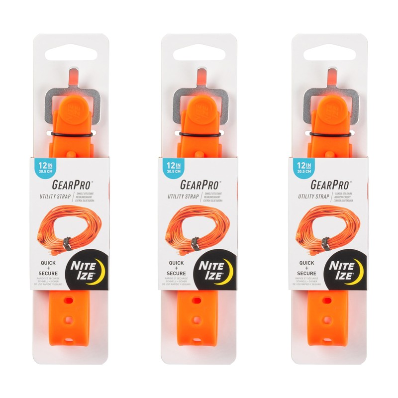 Nite Ize GearPro Utility Strap - Durable All-Purpose Utility Strap with Aluminum Buckle - Rubber Strap for Securing Equipment & Gear - UV-Resistant & Stretchy Strap - 12", Bright Orange (3 Pack)