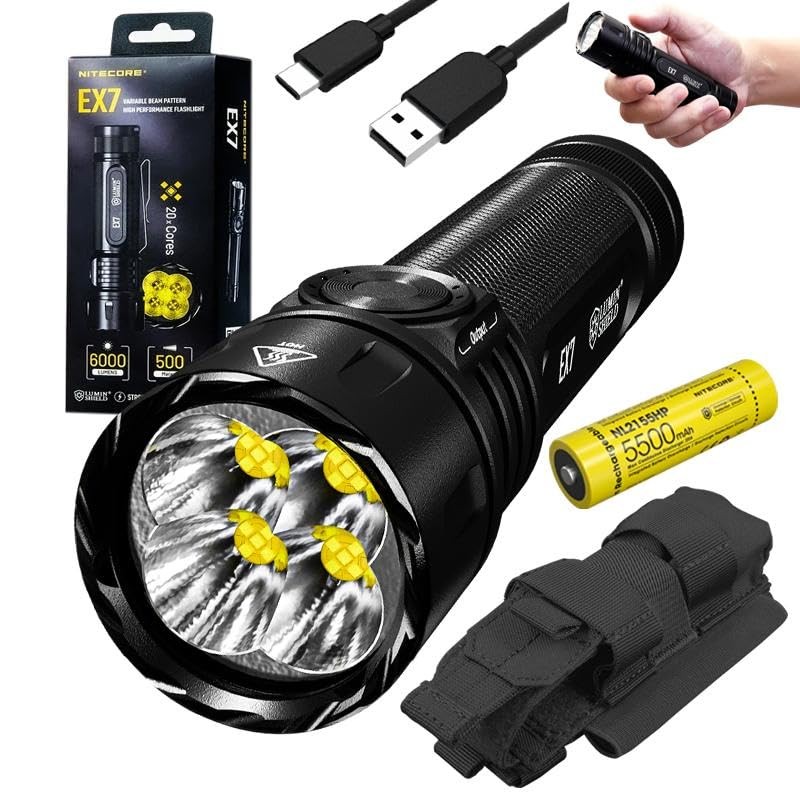 Nitecore EX7 + NCP30 Holster EX7 Variable Beam Pattern High Performance LED Rechargeable Flashlight -6000 Lumens w/ NCP30 Holster, NL2155HP Battery and USB C-Charging Cable