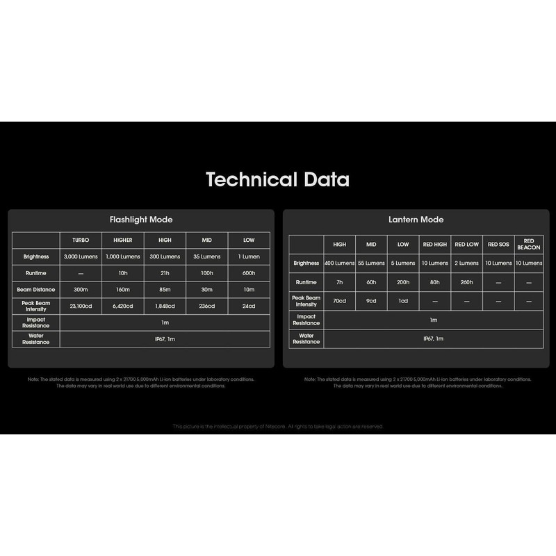 - Max Output: 3,000 Lumens (Flashlight Mode); 400 Lumens (Lantern Mode)
