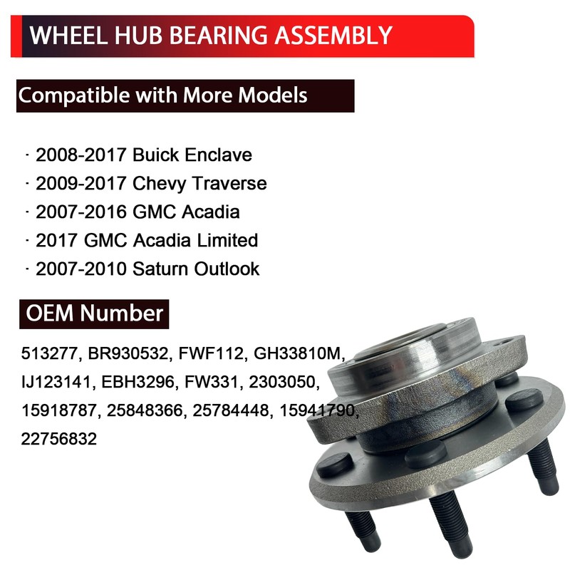 - [Vehicle Fitment] Front/Rear Wheel Hub Bearing Assembly Compatible with 2008-2017 Buick Enclave, 2009-2017 Chevy Traverse, 2007-2016 GMC Acadia, 2017 GMC Acadia Limited, 2007-2010 Saturn Outlook