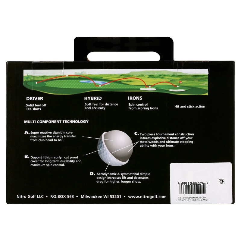 The Nitro Ultimate Distance Golf Balls are expertly crafted to elevate the performance of golfers at every skill level, providing a perfect blend of distance, control, and durability. These premium white golf balls feature an optimized spin ratio, enhancing ball control, particularly on the greens when putting. With strategically placed symmetrical dimples, these balls offer superior lift and flight stability, ensuring long, accurate shots. The advanced Dupont Lithium Surlyn cut-proof cover adds exceptional durability, making these balls resistant to cuts and abrasions for long-lasting performance. The two-piece tournament-grade construction is designed for compatibility with both metal woods and irons, providing versatility for all aspects of your game. Whether you're teeing off with a driver or approaching the green with an iron, these golf balls deliver unmatched distance and consistency. Packaged in a convenient 45-count box, the Nitro Ultimate Distance Golf Balls are the perfect choice for golfers looking to improve their distance, accuracy, and overall performance, making every swing count.