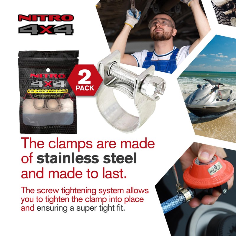 NITRO4X4 Stainless Steel Fuel Injector Hose Clamps Set - 2 Pack Adjustable Gas Line Hose Clamp (1/2 to 9/16 Inch, 13-15mm) - Heavy Duty Hose Clamp for Fuel Lines, Automotive Repairs
