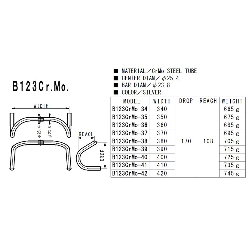 Nitto B123 B123CrMo-34 Drop Handle, Chrome Molybdenum, Diameter 1.0 inches (25.4 cm), 13.4 inches (340 cm), Silver