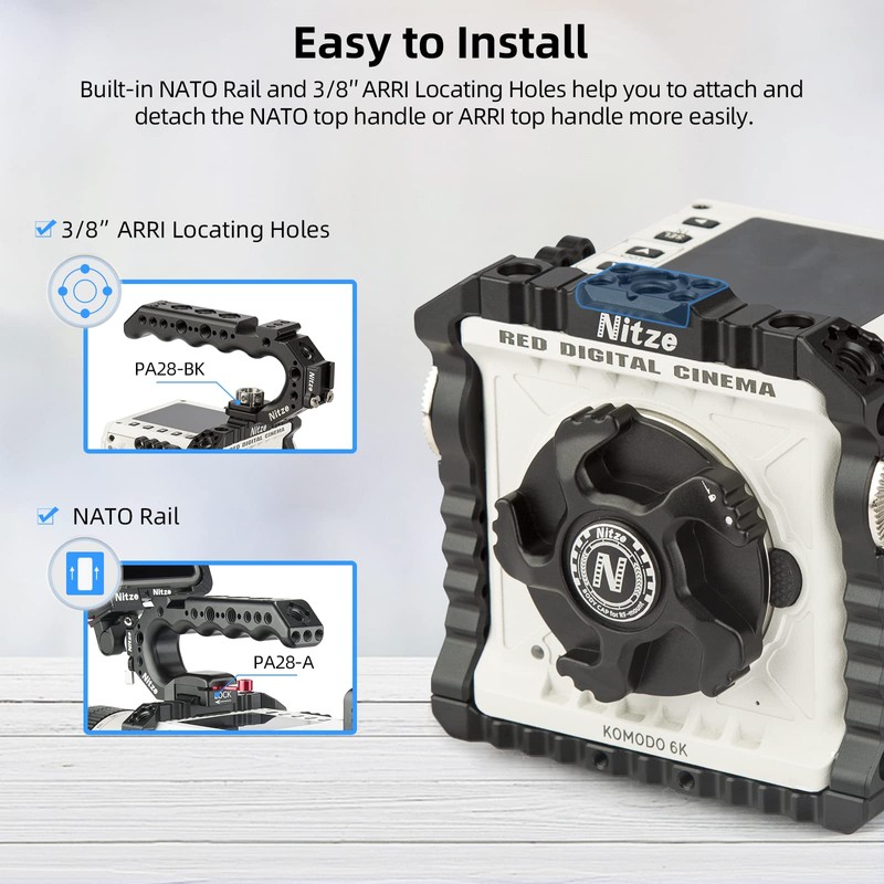 - Multiple attachment points: there are many 1/4 inch, 3/8 inch threaded holes, 1/4 inch positioning holes and 3/8 inch ARRI positioning holes on the cage for expanding the accessories. Built-in Nato rail and 3/8 inch Arri positioning holes on the top allow the installation of the Stinger upper handle of the Nitze PA28 series.