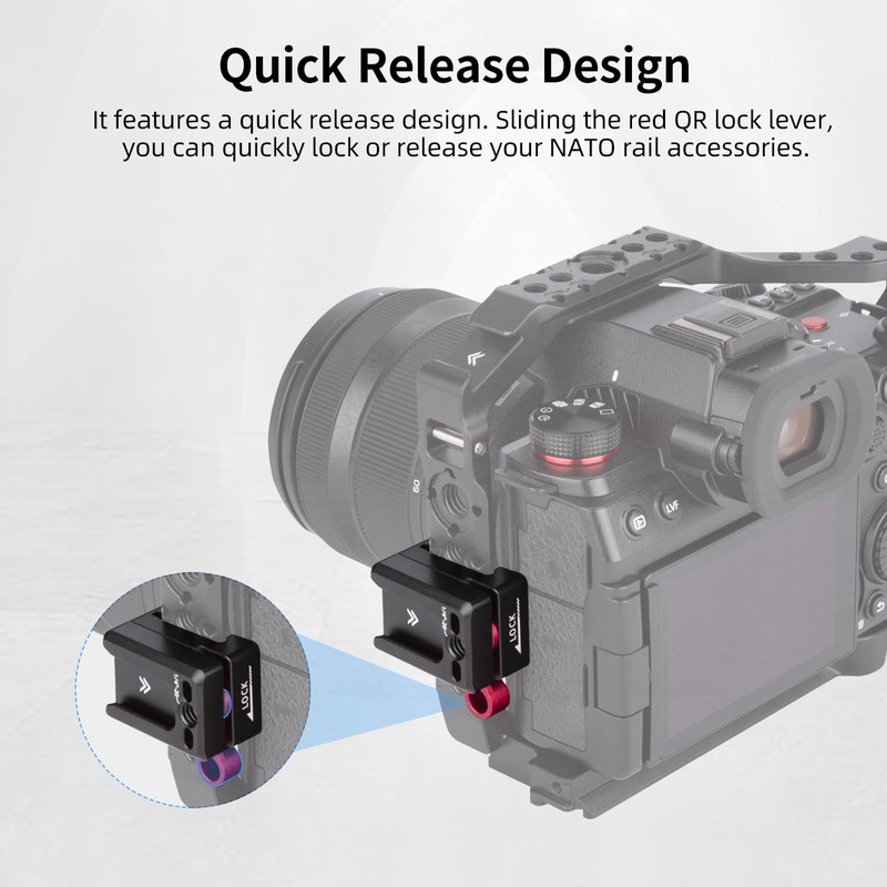 • Quick release design: Nitze NF49E NATO clamp has a quick release design. By moving the red QR locking lever, you can quickly lock or release your NATO rail accessories.