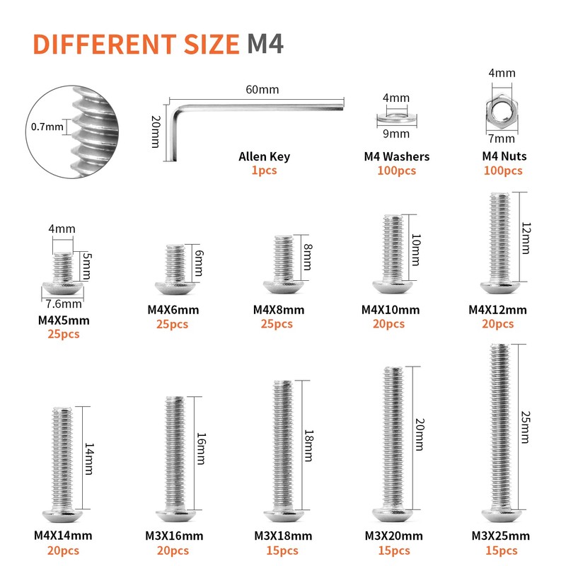 - Thread Diameter: 4mm; Thread Length: 5/6/8/10/12/14/16/18/20/25mm; Pitch Size: 0.7mm.