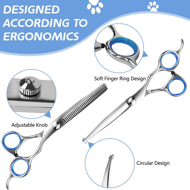 - Soft Finger Ring Design: The grooming scissors kit features soft silicone rings on the finger holes to provide a comfortable grip and enhance finger friction, ensuring better control over the scissors' movements and direction. This ergonomic design not only reduces hand fatigue during extended use but also improves work efficiency while minimizing hand strain.