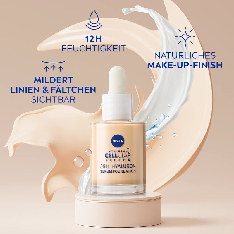 - Foundation meets serum - The Nivea 3-in-1 hyaluronic serum foundation combines the natural coverage of a foundation with the effectiveness of an anti-ageing serum.