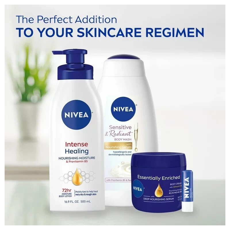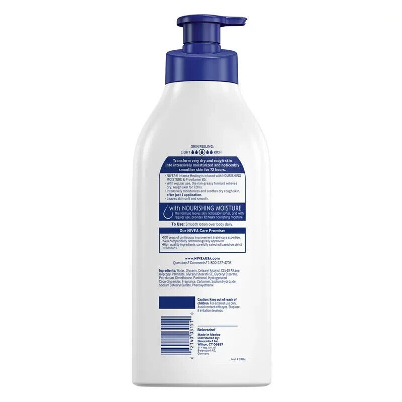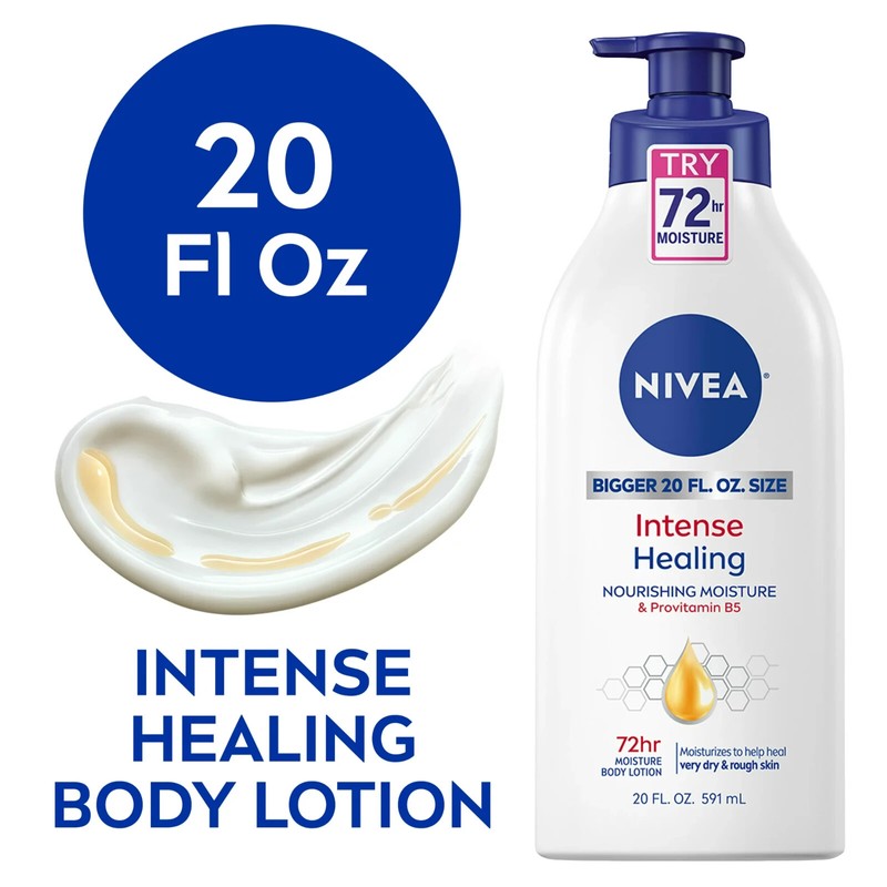 Reveal moisturized skin with NIVEA Intense Healing BodyLotion. This healing lotion is enriched with NIVEA Deep Nourishing Serum andProvitamin B5 to deliver deep nourishing moisture that lasts for up to 72hours. NIVEA Intense Healing lotion intensively moisturizes and soothes skin.This body lotion is ideal for those with very dry and rough skin, and it canalso be used as a hand lotion or foot lotion. NIVEA is proud to be one of theleading companies in the field of skin care products, with more than 130 yearsof experience. Daily body lotion is a key part of a skincare routine and thisproduct pairs well with NIVEA Body Wash as part of a daily skin care regimen.To use, smooth NIVEA Intense Healing Body Lotion over body daily.