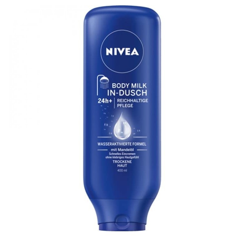 NIVEA In-shower "Body Milk" - for dry skin - 400 ml The fast type of rich care directly in the shower - for a smooth skin feeling. The result: supple skin without a sticky feeling. Additional cream with a normal body milk is no longer necessary. Leaves no residue in the towel. For dry skin 24 hours + moisture with almond oil, skin compatibility, dermatologically tested, biodegradable