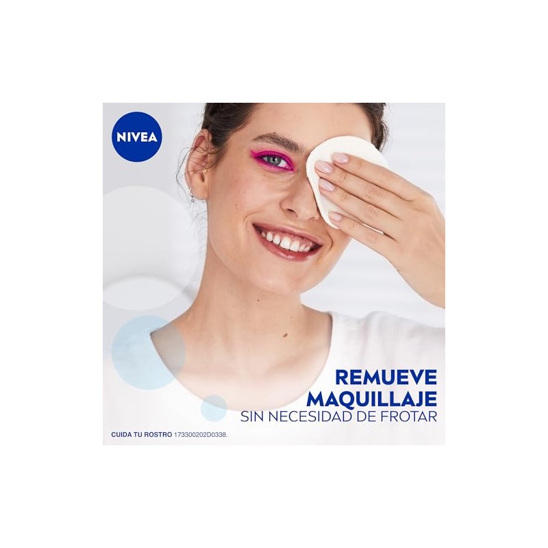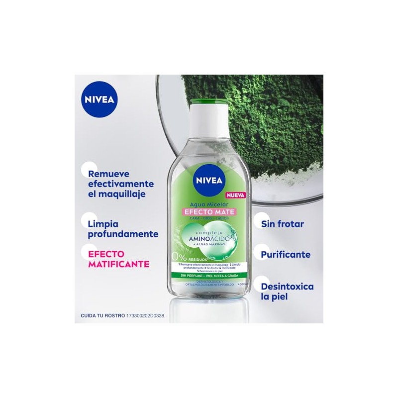 ¡Obtén una limpieza e hidratación profunda con nuestra Agua Micelar NIVEA Desmaquillante Efecto Mate y complejo Aminoácido. Nuestra agua micelar, enriquecida con micelas limpiadoras y gentiles, junto con un complejo aminoácido y algas marinas, elimina el maquillaje, impurezas y suciedad sin dejar una sensación grasosa en la piel. Su fórmula vegana purifica la piel sin secarla, dejándola limpia, suave y refrescada. Las micelas de nuestra agua desmaquillante actúan como un imán que atrapa efectivamente el maquillaje, suciedad e impurezas. MODO DE USO: Nuestra fórmula efectiva y delicada se puede usar en cara, ojos y labios. Simplemente aplica el producto sobre un algodón y pásalo suavemente por tu rostro, ojos y labios para retirar el maquillaje sin necesidad de frotar. Al final, sentirás tu piel fresca y tersa. BENEFICIOS: Remueve efectivamente el maquillaje. Limpia profundamente. Sin necesidad de frotar. Purifica y desintoxica la piel. Probado dermatológicamente.