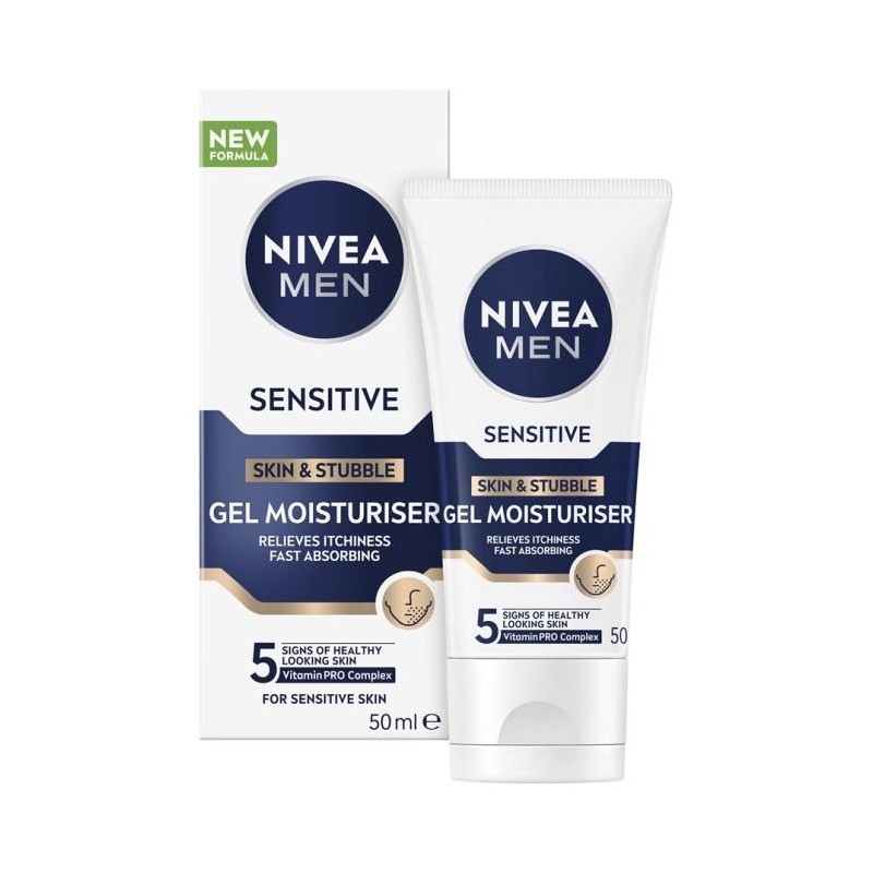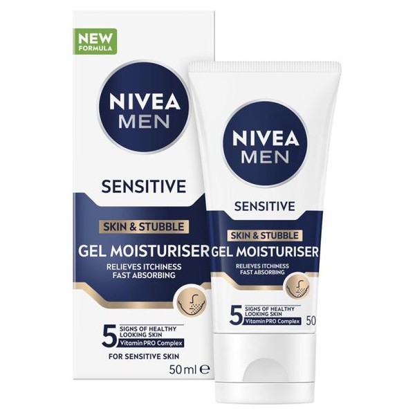 NIVEA MEN Sensitive Skin & Stubble Gel Moisturiser with VitaminPRO complex for an instantly absorbing formula for healthy-looking skin and well-groomed look all day long. The formula relieves itchiness and is non sticky and greasy to care for the 5 signs of healthy looking skin and stubble. NIVEA MEN Sensitive Skin & Stubble Gel Moisturiser with VitaminPRO complex for an instantly absorbing formula for healthy-looking skin and well-groomed look all day long. This face moisture contains Vitamin E, Provitamin B5 and Chamomile Extract the extra light formula relieves itchiness and is non sticky and greasy to care for the 5 signs of healthy looking skin and stubble. Including instant relief from skin irritation, 24H hydration, smooth stubble without cream residues, less sensitive skin with regular usage and daily skin comfort. Designed for sensitive skin the formula is alcohol-free* and dermatologically approved, for healthy looking and moisturised skin all day long. *no Ethyl alcohol