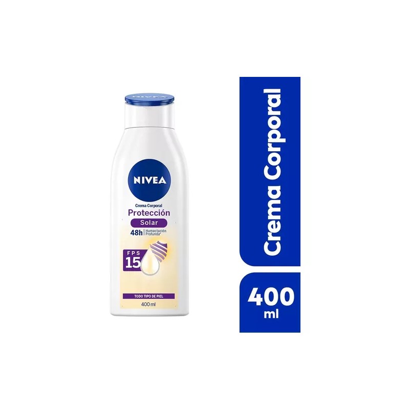 ✨ ¡Hidratación y protección solar en una sola crema! Nivea Crema Corporal Humectante con FPS 15 de 400ml para todo tipo de piel. Con Vitamina E y Aloe Vera, hidrata por 48h y protege contra el envejecimiento. ¡Rápida absorción!