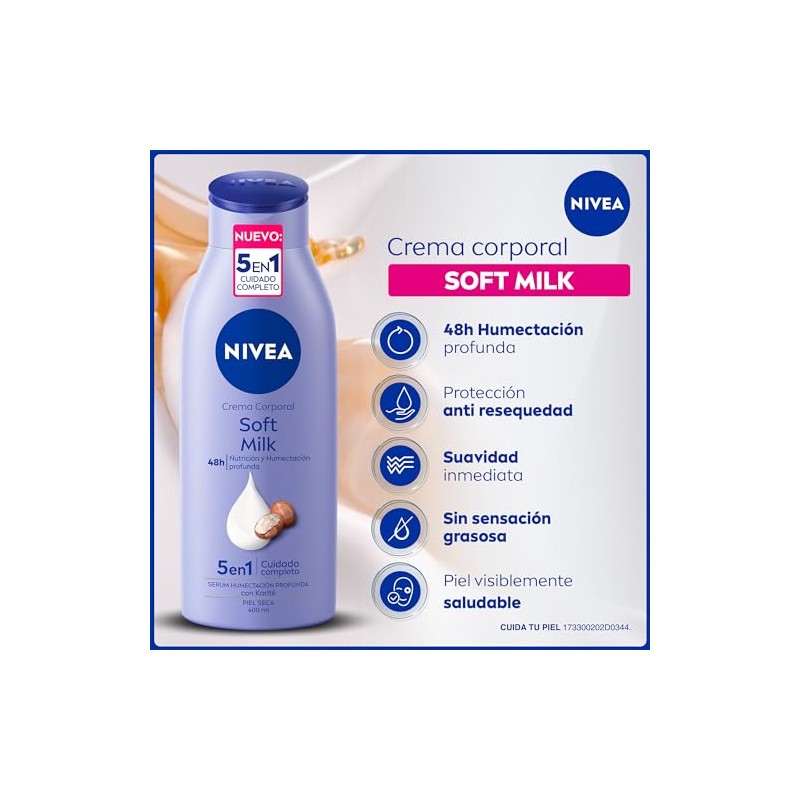 NIVEA - NIVEA Crema Corporal humectante Soft Milk (400 ml), 48 horas de Humectación y Suavidad Profunda con manteca de Karité ideal para Piel Seca. ⭐ Calidad premium certificada con excelentes reseñas. Construcción robusta y atención al detalle. 💝 Perfecto como regalo especial. Ideal para quienes buscan lo mejor en calidad y estilo. Producto auténtico con satisfacción total asegurada. ¡No te quedes sin el tuyo y aprovecha esta oportunidad única!