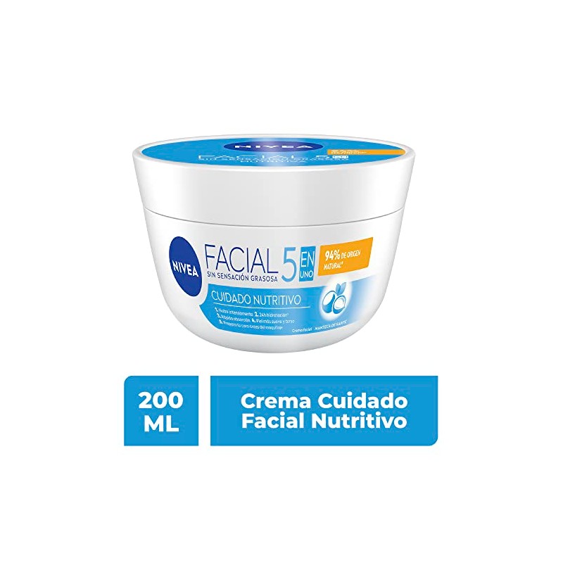 Complementa tu rutina de cuidado facial con nuestra crema facial hidratante 5 en 1 Cuidado Nutritivo de NIVEA. Su innovadora fórmula contiene Hidro nutrientes que al entrar en contacto con la piel del rostro se funden llegando hasta la capa más profunda proporcionando una hidratación intensiva, sin dejar residuos grasosos en la superficie. Nuestra crema facial brinda 24hrs de humectación sin sensación grasosa, nutrición gracias a su ingrediente manteca de karité, rápida absorción y textura ligera. Puede usarlo todos los días en toda su piel, ya que se absorbe rápidamente y está dermatológicamente aprobado para ser utilizado en la piel de la cara y el cuerpo. Su fórmula de alta calidad está libre de parabenos, alcohol y el 94% de sus ingredientes son de origen natural. Dermatológicamente probada para su uso diario. Funciones y beneficios La crema facial hidratante NIVEA 5 en 1 Cuidado Nutritivo proporciona una rápida absorción e hidratación hasta por 24 horas. Su fórmula ligera con hidro nutrientes mejora notablemente la apariencia de la piel, sin dejar una sensación grasosa. Formulada especialmente para todo tipo de piel; libre de parabenos y alcohol. Su fragancia delicada hará de su aplicación una experiencia agradable despertando tus sentidos.