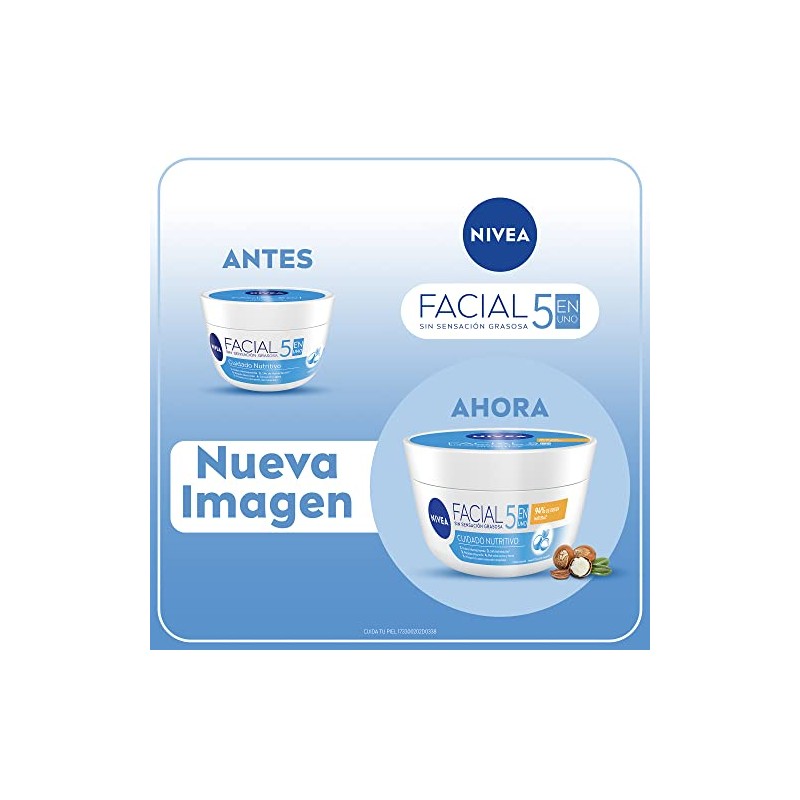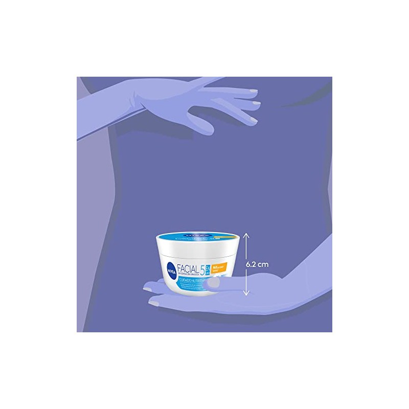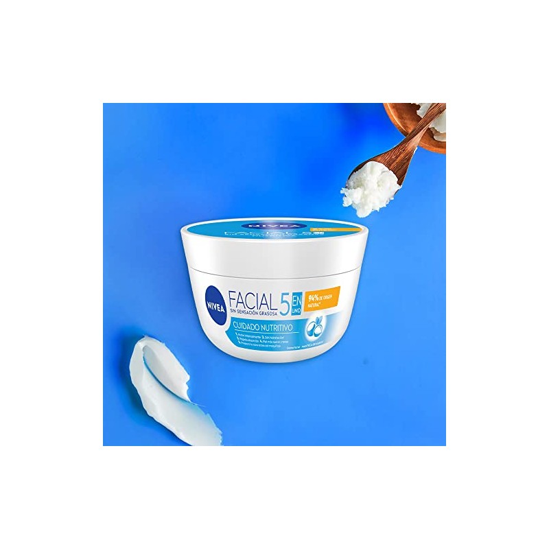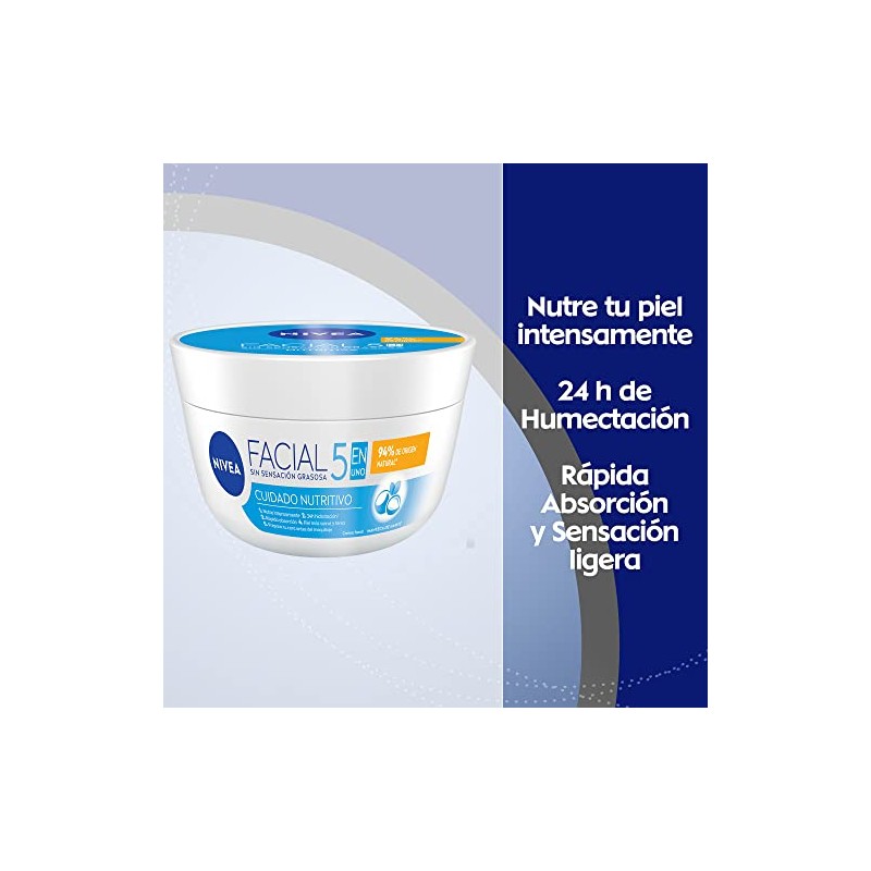 Complementa tu rutina de cuidado facial con nuestra crema facial hidratante 5 en 1 Cuidado Nutritivo de NIVEA. Su innovadora fórmula contiene Hidro nutrientes que al entrar en contacto con la piel del rostro se funden llegando hasta la capa más profunda proporcionando una hidratación intensiva, sin dejar residuos grasosos en la superficie. Nuestra crema facial brinda 24hrs de humectación sin sensación grasosa, nutrición gracias a su ingrediente manteca de karité, rápida absorción y textura ligera. Puede usarlo todos los días en toda su piel, ya que se absorbe rápidamente y está dermatológicamente aprobado para ser utilizado en la piel de la cara y el cuerpo. Su fórmula de alta calidad está libre de parabenos, alcohol y el 94% de sus ingredientes son de origen natural. Dermatológicamente probada para su uso diario. Funciones y beneficios La crema facial hidratante NIVEA 5 en 1 Cuidado Nutritivo proporciona una rápida absorción e hidratación hasta por 24 horas. Su fórmula ligera con hidro nutrientes mejora notablemente la apariencia de la piel, sin dejar una sensación grasosa. Formulada especialmente para todo tipo de piel; libre de parabenos y alcohol. Su fragancia delicada hará de su aplicación una experiencia agradable despertando tus sentidos.