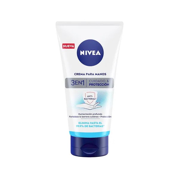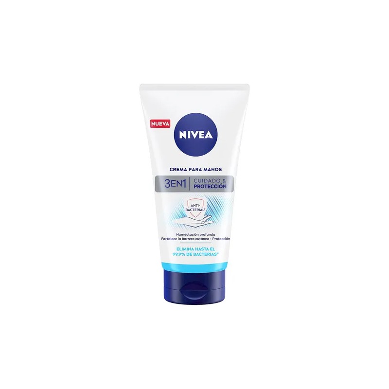 Crema Para Manos Humectante Nivea Cuidado & Protección 75ml proporciona hidratación intensa para manos resecas y ásperas. Su fórmula 3 en 1 con efecto antibacterial, sin alcohol y dermatológicamente probada, incluye propiedades antibacteriales y aceite de jojoba.
