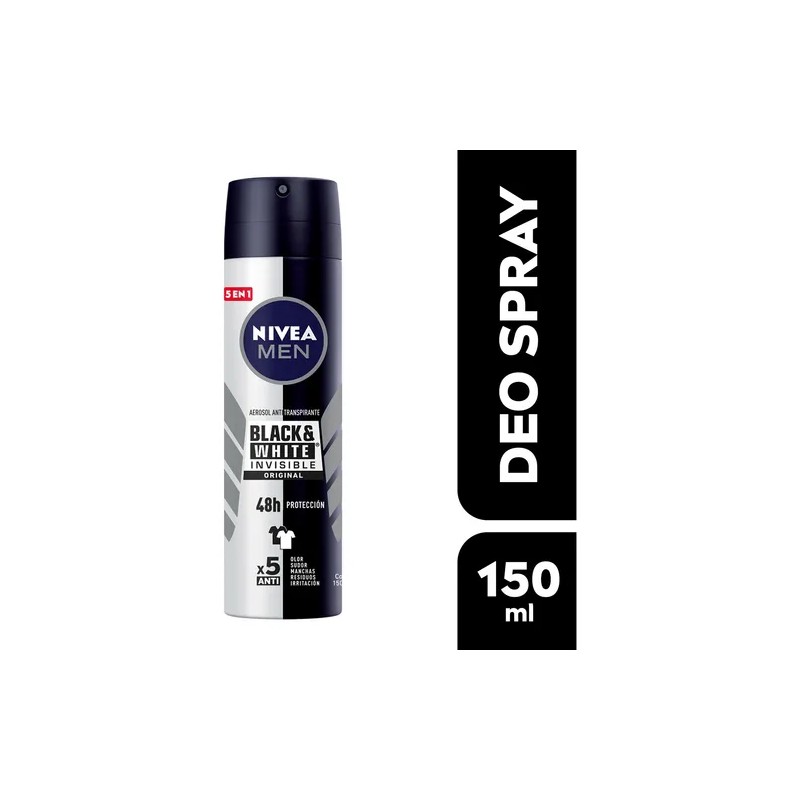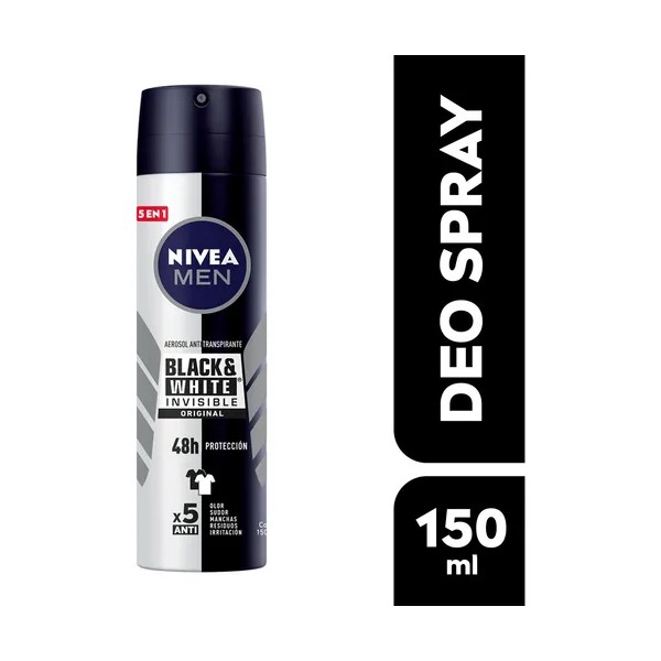 El desodorante en spray Nivea Men black & white invisible original es un antitranspirante con 48 horas de protección contra la humedad de las axilas y el olor corporal.