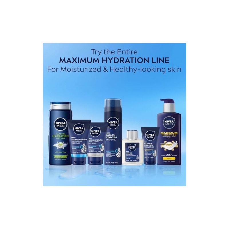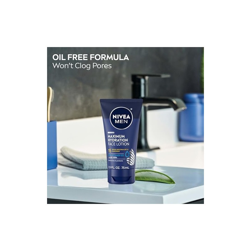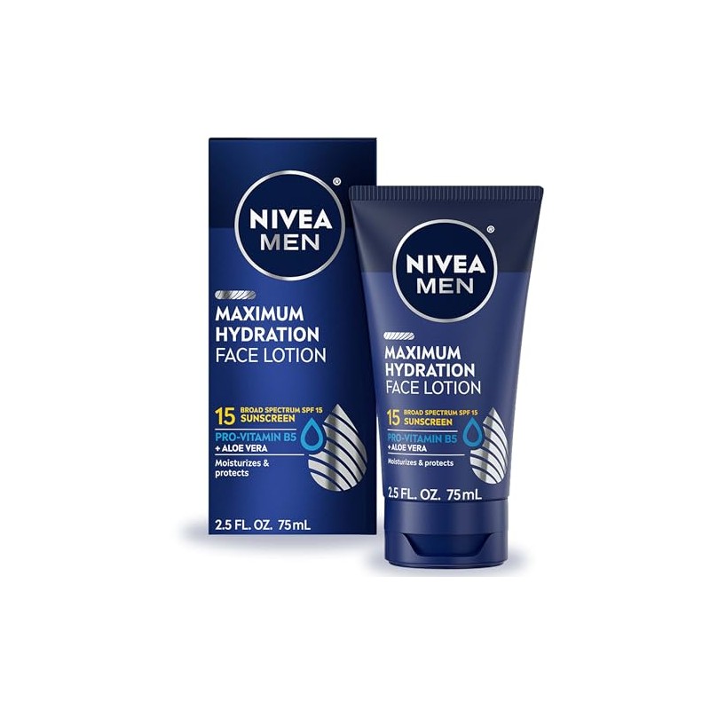 Hydrate and help protect dry skin with NIVEA MEN Maximum Hydration Face Lotion with Broad Spectrum SPF 15 sunscreen. Designed by skincare experts and specially formulated for men's skin, this lightweight facial moisturizer with sunscreen helps to protect and moisturize skin. The hydrating formula is enriched with Aloe Vera, Provitamin B5 and our maximum level of moisturizers, to leave skin hydrated for 24 hours. Ideal for everyday use, this men's face moisturizer absorbs easily and provides long-lasting moisture to relieve dry, tight skin. It is also dermatologically tested for skin compatibility. This hydrating face moisturizer with SPF 15 Broad Spectrum sunscreen helps protect against harmful UVA and UVB sun damage and helps to prevent sunburn and early signs of aging if used as directed with other sun protection measures (See Directions). With a paraben-free and dye-free formula, this hydrating face moisturizer for men is suitable for daily use as a part of a sun-safe regimen. A daily, beard-friendly sunscreen moisturizer is a key part of a skincare routine, and this NIVEA facial lotion for men pairs well with NIVEA MEN Maximum Hydration Face Wash. NIVEA MEN is a trusted leader in skincare products, with more than 130 years of expertise.