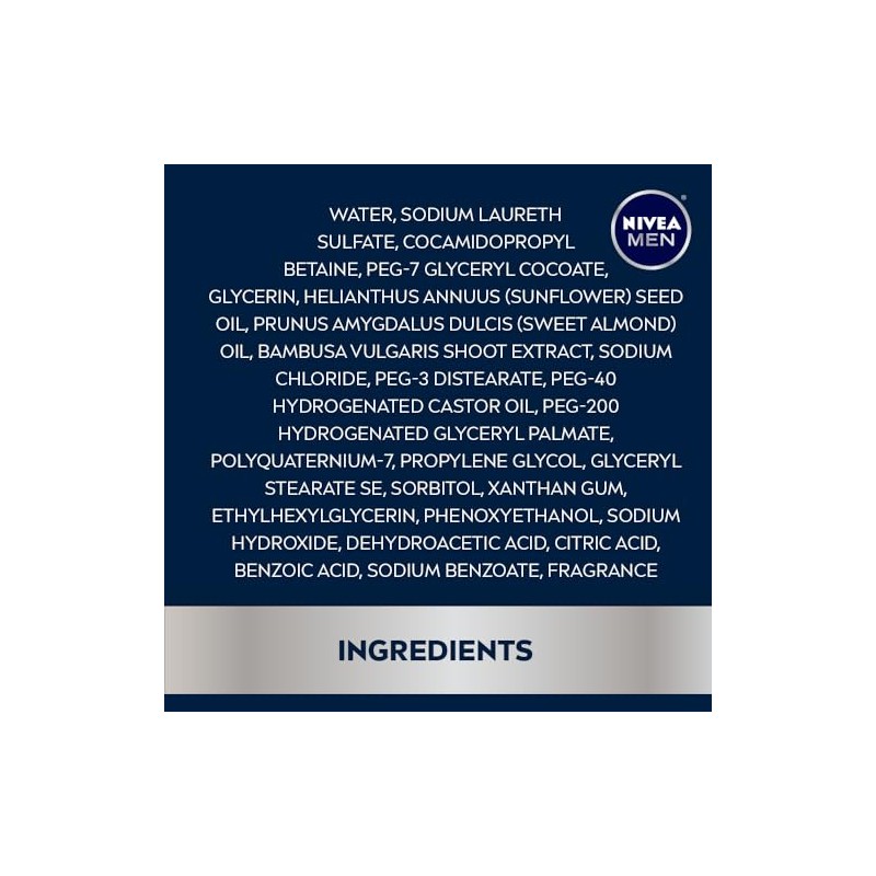 Treat your skin to a gentle but effective clean with NIVEA MEN Sensitive Body Wash. This NIVEA MEN body wash for sensitive skin is enriched with Bamboo extract. It gently cleanses and soothes sensitive skin, leaving it feeling hydrated and comfortable. The -in- shower gel can be used as a face wash, shampoo and body wash. Specifically crafted for men's skin care needs, this soothing mens body wash does not dry out skin, making it great for everyday use on sensitive skin. Plus, it has a vegan formula (no animal-derived ingredients) that's free from soaps, microplastic particles, parabens, phthalates and dyes. This pH skin-friendly, sensitive skin body wash is formulated with % naturally derived ingredients and a % biodegradable formula, plus it's packaged in a bottle made from % recycled plastic, reflecting NIVEA's commitment to sustainability. Complete your skin care routine by pairing this hydrating body wash with NIVEA MEN Maximum Hydration Nourishing Body Lotion. Naturally derived ingredients, including purified water, have undergone processing while retaining a majority of their natural molecular structure. % skin safe synthetics are included to maintain the integrity of the formula. as per OECD or equivalent methods excluding label
