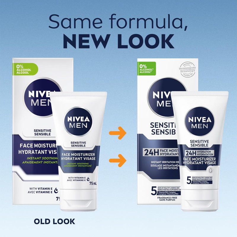 NIVEA MEN Sensitive Skin Face Moisture Cream – make your sensitive skin look healthy and cared for. NIVEA MEN Sensitive Skin Face Moisture Cream has been designed specifically for men with sensitive skin. If you suffer from dry or sensitive skin, you need a face cream that is gentle on your skin. Our non-greasy formula is fragrance, colorant, and alcohol-free meaning it won't irritate your skin. The special moisturizing formula enriched with Vitamin E and Chamomile gently nourishes dry and sensitive skin, leaving it smooth and hydrated. Method of application: Cleanse skin thoroughly with luke-warm water. Gently massage the cream into your skin, paying attention to dry areas and avoiding contact with your eyes. Suitable for both morning and evening application.