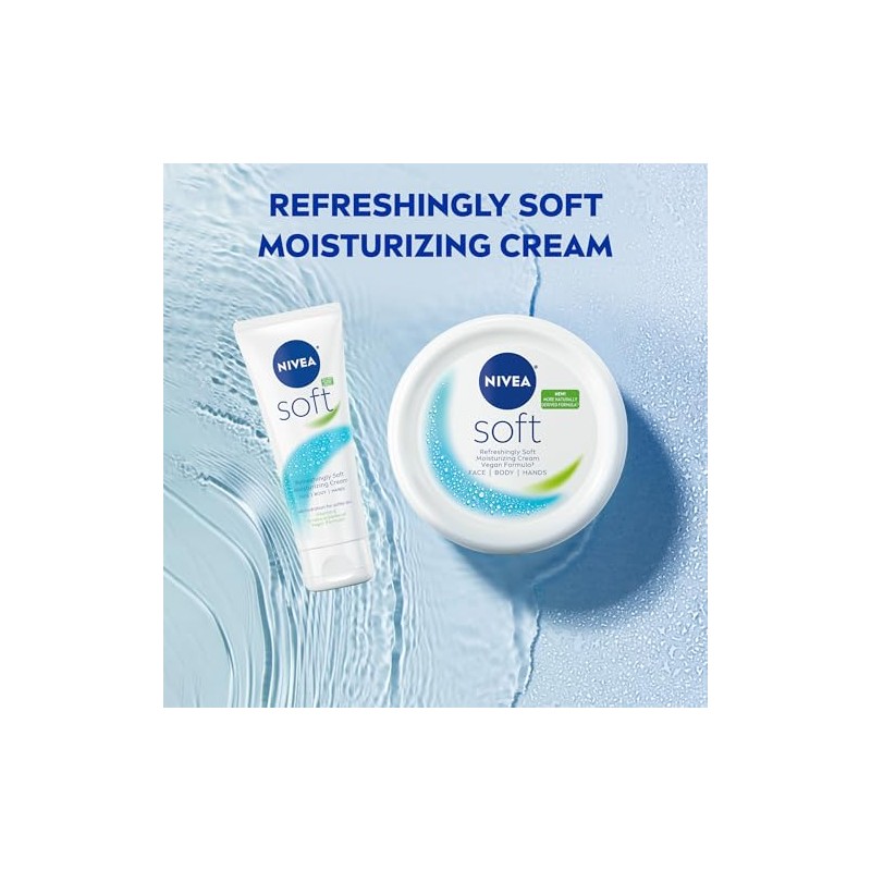 Product Description For soft, beautiful skin count on NIVEA Soft Refreshingly Soft Moisturizing Cream. NIVEA Soft is an all-in-one refreshing face cream, body cream and hand cream that delivers -hour hydration for soft, supple skin. This body cream moisturizer is vegan() and the refreshingly light formula is enriched with Jojoba Oil and Vitamin E for softer, smoother skin without that greasy feel. This fast-absorbing body moisturizer is suitable for all skin types. NIVEA Soft cream gives dry skin on the body, face and hands the refreshing, hydrating skincare it deserves. To use, smooth this dry skin moisturizer onto your skin daily. For the best results, apply this dry skin cream after showering and on hands after washing them. NIVEA is proud to be one of the leading companies in the field of skin care products, with more than years of expertise. ()no animal derived ingredients ()vs. previous formula ()naturally derived ingredients have undergone processing while retaining the majority of their natural molecular structure ()skin safe synthetic ingredients are included to maintain the integrity of the product (Myristyl Alcohol, Tocopheryl Acetate, Sodium Hydroxide, Phenoxyethanol, Fragrance) From the Manufacturer Enriched with jojoba oil and Vitamin E. Leaves skin incredibly soft. Fast absorbing and non-greasy. Great for night-time use.