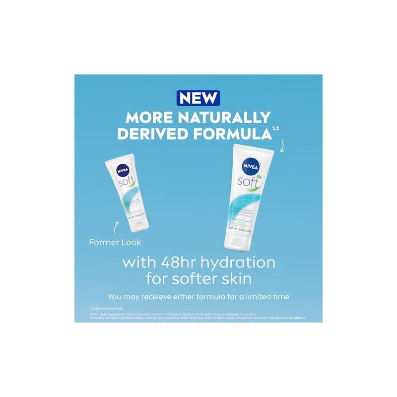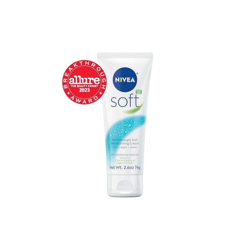 Product DescriptionFor soft, beautiful skin count on NIVEA Soft Refreshingly Soft Moisturizing Cream. NIVEA Soft is an all-in-one refreshing face cream, body cream and hand cream that delivers 48-hour hydration for soft, supple skin. This body cream moisturizer is vegan(1) and the refreshingly light formula is enriched with Jojoba Oil and Vitamin E for softer, smoother skin without that greasy feel. This fast-absorbing body moisturizer is suitable for all skin types. NIVEA Soft cream gives dry skin on the body, face and hands the refreshing, hydrating skincare it deserves. To use, smooth this dry skin moisturizer onto your skin daily. For the best results, apply this dry skin cream after showering and on hands after washing them. NIVEA is proud to be one of the leading companies in the field of skin care products, with more than 130 years of expertise. (1)no animal derived ingredients (2)vs. previous formula (3)naturally derived ingredients have undergone processing while retaining the majority of their natural molecular structure (4)skin safe synthetic ingredients are included to maintain the integrity of the product (Myristyl Alcohol, Tocopheryl Acetate, Sodium Hydroxide, Phenoxyethanol, Fragrance)From the ManufacturerEnriched with jojoba oil and Vitamin E. Leaves skin incredibly soft. Fast absorbing and non-greasy. Great for night-time use.