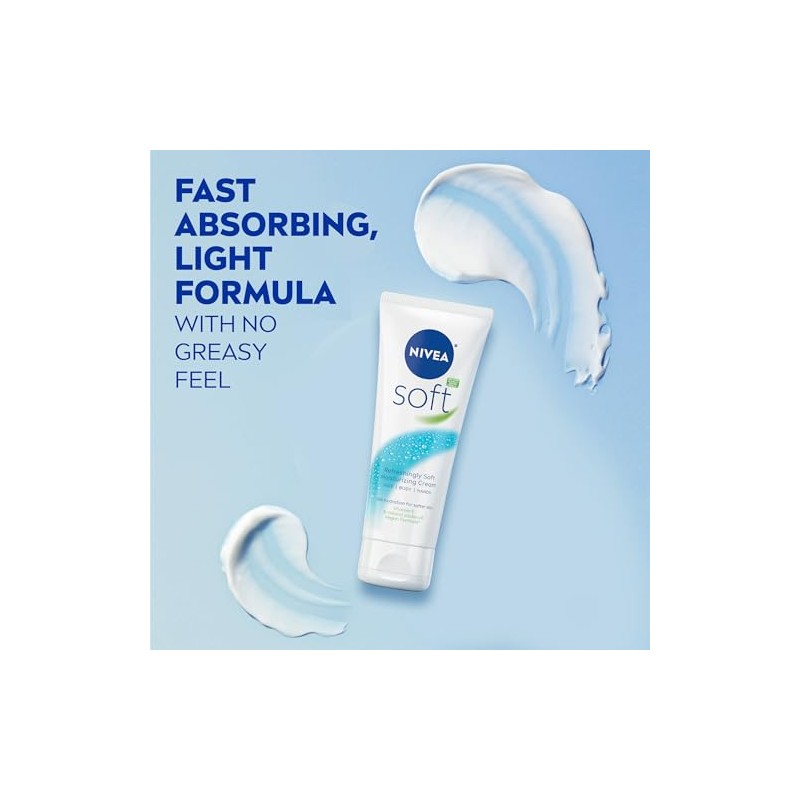 - FAST-ABSORBING: NIVEA Soft is a fast-absorbing, lightweight moisturizer for dry skin with Vitamin E and Jojoba Oil that provides softer, smoother skin without a greasy feel
