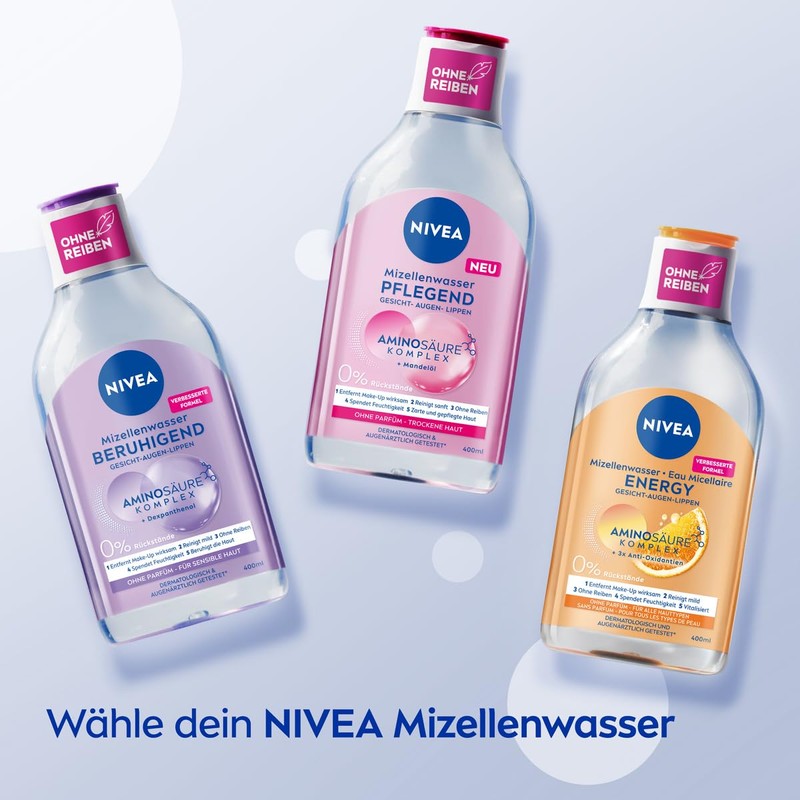 - Pflegende Formel – Angereichert mit reinigenden Mizellen, sanften Aminosäuren und Mandelöl, eignet sich das NIVEA Mizellenwasser auch für sensible Haut