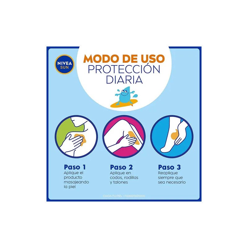 MODO DE USO: Antes de abrir el envase, asegúrate de agitarlo bien. Aplica el protector solar generosamente sobre la piel antes de exponerte al sol, asegurándote de cubrir todas las áreas expuestas. Para mantener la protección, repite la aplicación del producto con frecuencia, especialmente después de nadar, sudar o secarte con una toalla.