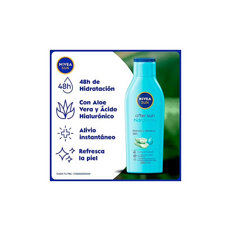 • Cuida tu piel del sol con los expertos en protección solar: NIVEA La loción solar de NIVEA SUN After Sun Moisture, refresca y calma la piel después de la exposición al sol para aliviar instantáneamente los signos de la piel estresada por el sol. La fórmula de cuidado con Bio