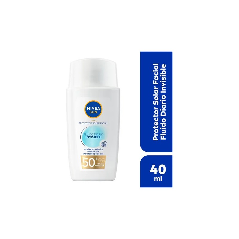 NIVEA SUN Fluido Diario Invisible FPS 50+ ofrece protección solar avanzada contra los rayos UVA/UVB, combinada con una fórmula ultraligera y antioxidante enriquecida con Licocalcón A y Niacinamida, ideales para el control de grasa y el cuidado anti-imperfecciones.