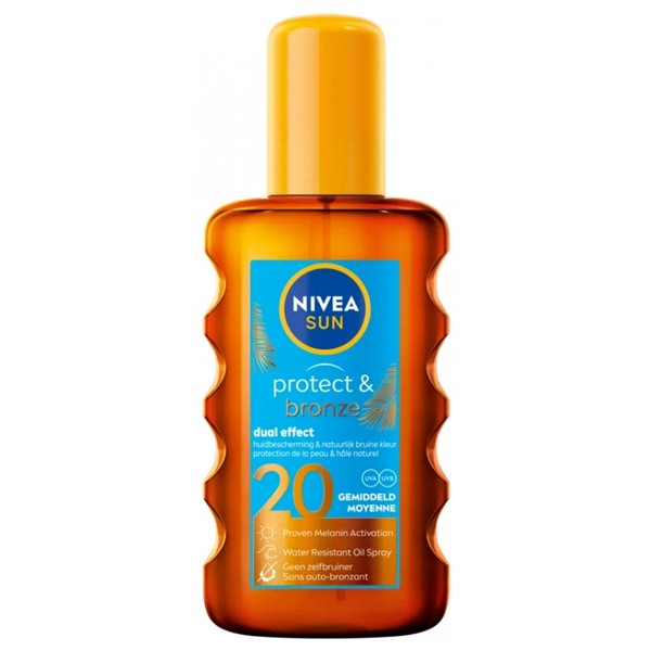 Nivea Sun Protect & Bronze Dry Oil SPF20 200 ml is a tan-activating dry oil. This oil offers dual action: it protects the skin and provides a natural tan thanks to pro-melanin extract, which stimulates melanin.